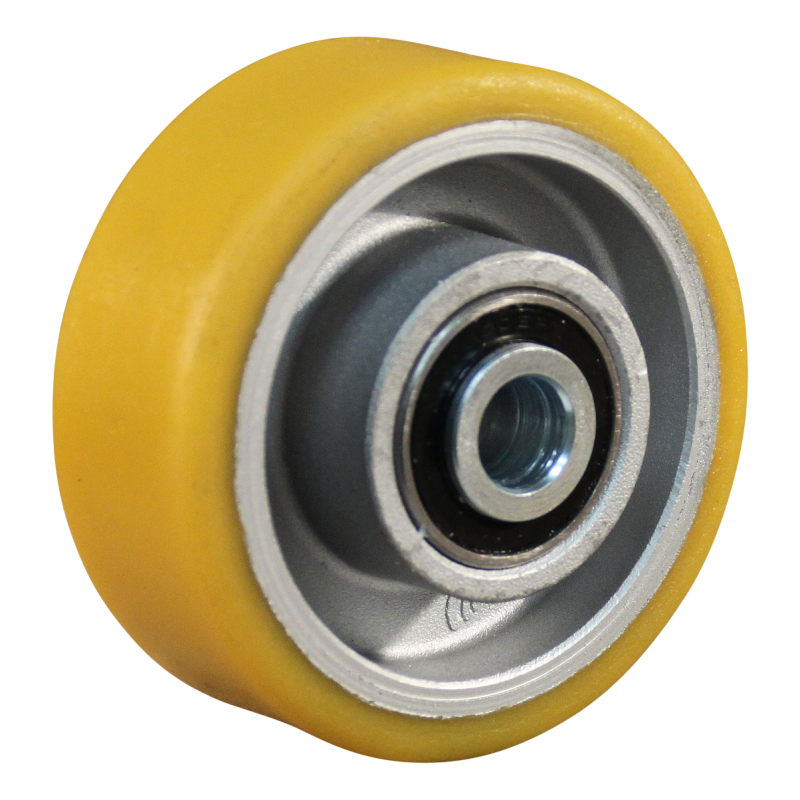 Dit is een los wiel gemaakt van aluminium. Het materiaal van de velg is aluminium en van het loopvlak PU (RAL 1005 honinggeel). De diameter van het wiel is 80 millimeter en de breedte 30 millimeter. De naaflengte bedraagt 40 millimeter bij een asgat van 12 millimeter. Het draagvermogen is 175 kilo. Het wiel is gelagerd met een kogellager.