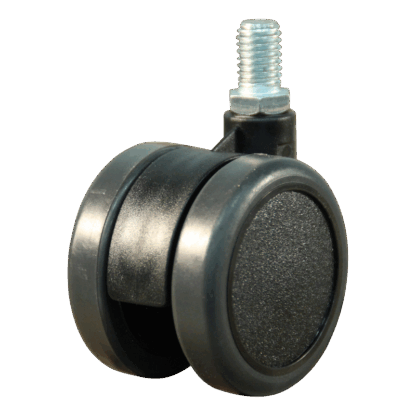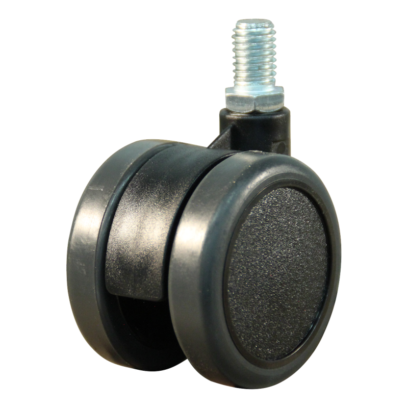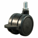 Dit is een zwenkwiel met een kunststoffen gaffel. Het zwenkwiel wordt bevestigd met een draadstift. De bouwhoogte bedraagt 81 mm. Het materiaal van de velg is PA (zwart van kleur) en van het loopvlak PU (grijs van kleur). Het wiel heeft een diameter van 50 mm en een breedte van 43 mm. Het draagvermogen is 50 kg. De lagering bestaat uit een glijlager. Merk: Novio.