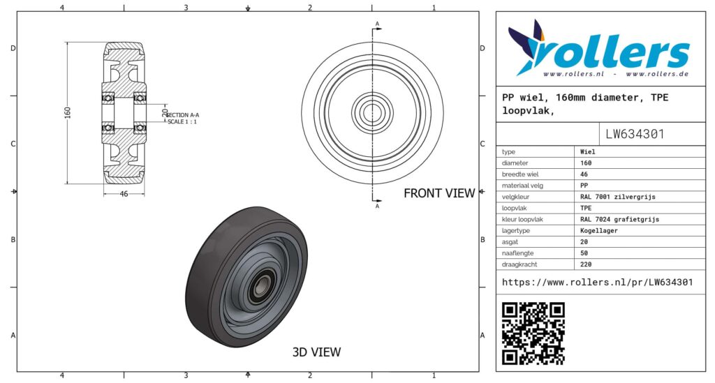Dit is een los wiel gemaakt van PP. Het materiaal van de velg is PP (RAL 7001 zilvergrijs) en van het loopvlak TPE (RAL 7024 grafietgrijs). Het wiel heeft een diameter van 160 mm en een breedte van 46 mm. De naaflengte bedraagt 50 mm bij een asgat van 20 mm. De draagkracht is 220 kilo. De lagering bestaat uit een kogellager.