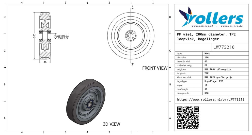 Dit is een los wiel van het materiaal PP. Het materiaal van de velg is PP (RAL 7001 zilvergrijs van kleur) en van het loopvlak TPE (kleur RAL 7024 grafietgrijs). De diameter van het wiel is 200 millimeter en de breedte 46 millimeter. De naaflengte is 50 millimeter en het asgat heeft een diameter van 12 millimeter. Het wiel heeft een draagvermogen van 300 kilogram. Het wiel is gelagerd met een kogellager RVS.
