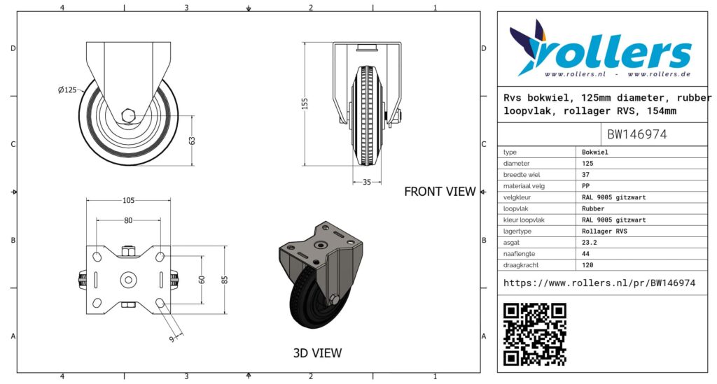 Dit is een bokwiel met een gaffel van rvs. De bouwhoogte is 154 millimeter. Het materiaal van de velg is PP (RAL 9005 gitzwart van kleur) en van het loopvlak rubber (RAL 9005 gitzwart van kleur). Het wiel heeft een diameter van 125 millimeter en een breedte van 37 millimeter. De naaflengte bedraagt 44 millimeter bij een asgat van 23.2 millimeter. Het bokwiel heeft een draagvermogen van 120 kg. Het wiel is gelagerd met een rollager RVS. Dit product komt in onze shop voor in de volgende categorieën: Rubberen wielen, Vuilcontainer wielen, Rolcontainer wielen, RVS bokwielen, Bokwielen 100 kg, Bokwielen 125 mm, Transportwielen, Bokwiel.