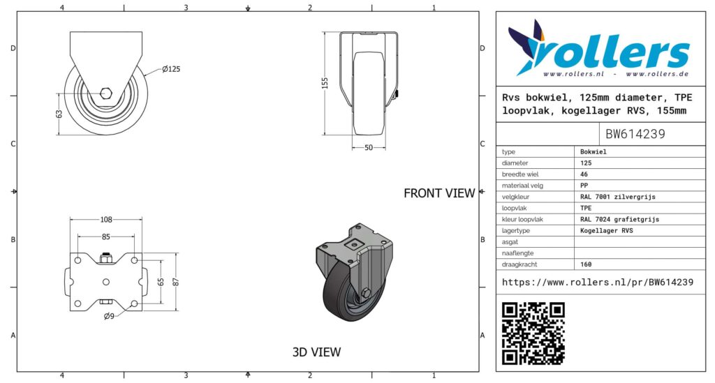 Dit is een bokwiel met een gaffel van rvs. De bouwhoogte is 155 millimeter. De velg is gemaakt van PP (RAL 7001 zilvergrijs) en het loopvlak is van TPE (RAL 7024 grafietgrijs van kleur). De diameter van het wiel is 125 millimeter en de breedte 46 millimeter. Het draagvermogen is 160 kilogram. De lagering bestaat uit een kogellager RVS. Merk: Novio.