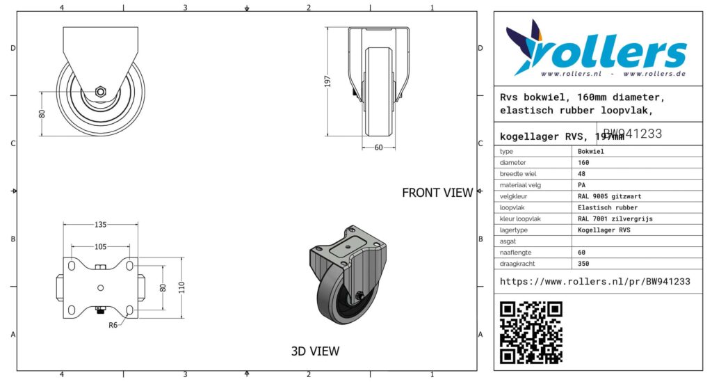 Dit is een bokwiel met een gaffel van rvs. De bouwhoogte is 197 mm. De velg is gemaakt van PA (kleur RAL 9005 gitzwart) en het loopvlak is van elastisch rubber (RAL 7001 zilvergrijs). De diameter van het wiel is 160 mm en de breedte 48 mm. Het wiel heeft een draagvermogen van 350 kilo. De lagering bestaat uit een kogellager RVS.