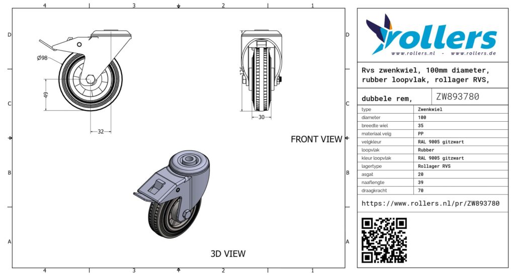 Dit is een rvs zwenkwiel. Het wiel heeft een rem van het type dubbele rem, naloop. De bevestiging is van het type boutgat. De bouwhoogte bedraagt 127 millimeter. Het materiaal van de velg is PP (RAL 9005 gitzwart van kleur) en van het loopvlak rubber (RAL 9005 gitzwart van kleur). Het wiel heeft een diameter van 100 millimeter en een breedte van 35 millimeter. De naaflengte bedraagt 39 millimeter bij een asgat van 20 millimeter. Het draagvermogen is 70 kilo. Het wiel is gelagerd met een rollager RVS. Rollers.nl heeft dit product in de volgende categorieën ingedeeld: Rubberen wielen, RVS zwenkwielen, Zwenkwielen 50 kg, Rubberen zwenkwielen, Zwenkwielen 100 mm, Transportwielen, Zwenkwielen met rem, Zwenkwiel.