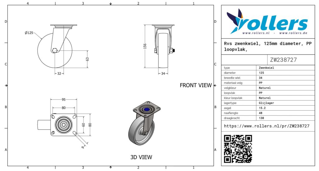 Rvs zwenkwiel, 125mm diameter, PP loopvlak, glijlager