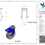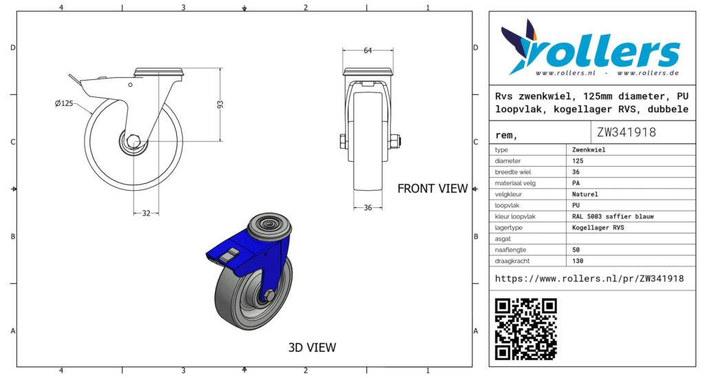 Dit zwenkwiel heeft een gaffel van rvs. Dit wiel heeft een dubbele rem, naloop. Deze kan worden bevestigd door middel van een boutgat. De bouwhoogte is 154 millimeter. De velg is gemaakt van PA (naturel van kleur) en het loopvlak is van PU (RAL 5003 saffier blauw). Het wiel heeft een diameter van 125 millimeter en een breedte van 36 millimeter. Het zwenkwiel heeft een draagvermogen van 130 kilogram. De lagering bestaat uit een kogellager RVS.