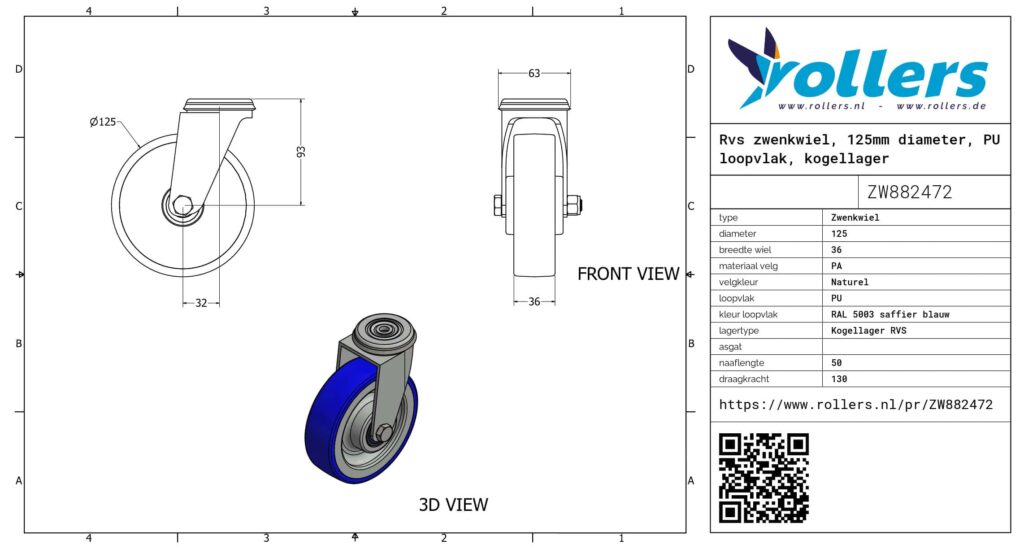 Dit is een zwenkwiel met een rvs gaffel. De bevestiging is van het type boutgat. Het wiel heeft een bouwhoogte van 155 mm. Het materiaal van de velg is PA (naturel van kleur) en van het loopvlak PU (RAL 5003 saffier blauw). De diameter van het wiel is 125 mm en de breedte 36 mm. Het wiel heeft een draagvermogen van 130 kg. Het wiel is gelagerd met een kogellager RVS. Rollers.nl heeft dit product in de volgende categorieën ingedeeld: RVS zwenkwielen, Zwenkwielen 125 mm, Polyurethaan wielen, Zwenkwielen 100 kg, Transportwielen, Zwenkwielen zonder rem, PU wielen, Zwenkwiel.