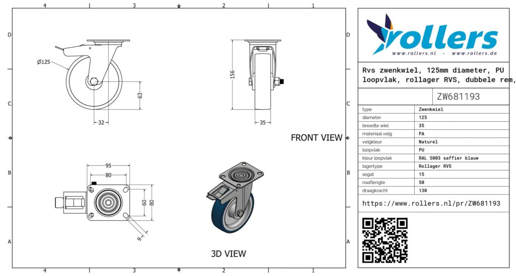 Dit is een rvs zwenkwiel. Dit wiel heeft een dubbele rem, naloop. Het zwenkwiel wordt bevestigd met een plaat. De bouwhoogte bedraagt 155 millimeter. Het materiaal van de velg is PA (kleur naturel) en van het loopvlak PU (kleur RAL 5003 saffier blauw). Het wiel heeft een diameter van 125 millimeter en een breedte van 35 millimeter. De naaflengte is 50 millimeter en het asgat heeft een diameter van 15 millimeter. Het draagvermogen is 130 kg. Het wiel is gelagerd met een rollager RVS. U vindt dit product in onze categorieën: Vuilcontainer wielen, Rolcontainer wielen, RVS zwenkwielen, Zwenkwielen 125 mm, Polyurethaan wielen, Zwenkwielen 100 kg, Transportwielen, Zwenkwielen met rem, PU wielen, Zwenkwiel.