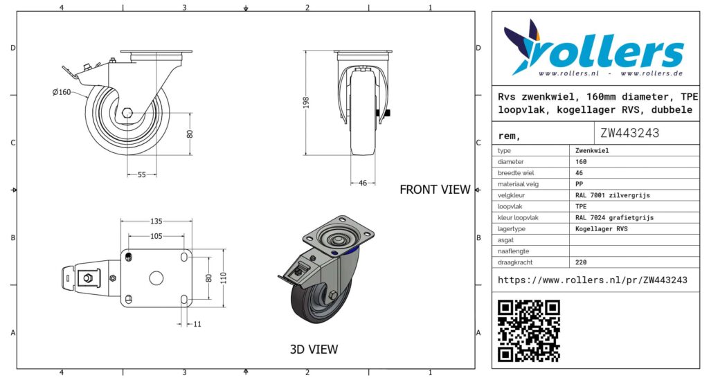 Rvs zwenkwiel, 160mm diameter, TPE loopvlak, kogellager RVS, dubbele rem, naloop