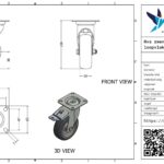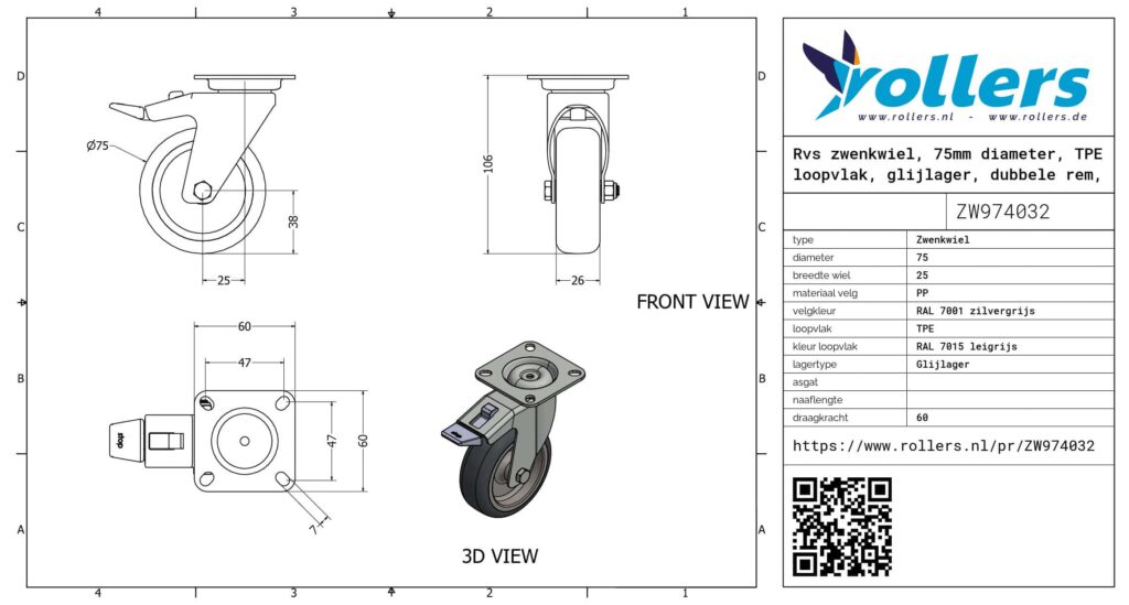 Dit is een zwenkwiel van rvs. Het wiel heeft een rem van het type dubbele rem, naloop. Het zwenkwiel wordt bevestigd met een plaat. Het wiel heeft een bouwhoogte van 106 mm. De velg is gemaakt van PP (kleur RAL 7001 zilvergrijs) en het loopvlak is van TPE (RAL 7015 leigrijs van kleur). De diameter van het wiel is 75 mm en de breedte 25 mm. Het wiel heeft een draagvermogen van 60 kilogram. De lagering bestaat uit een glijlager. Merk: Novio.