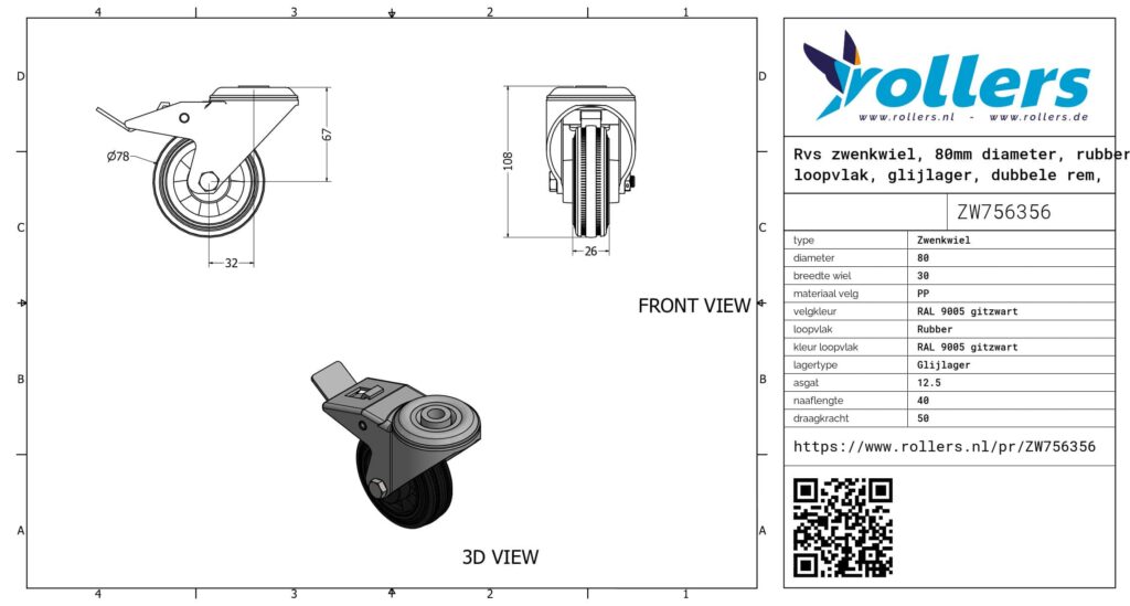 Dit zwenkwiel heeft een gaffel van rvs. De rem is van het type dubbele rem, naloop. Het zwenkwiel wordt bevestigd met een boutgat. De bouwhoogte bedraagt 108 mm. De velg is gemaakt van PP (RAL 9005 gitzwart) en het loopvlak is van rubber (RAL 9005 gitzwart van kleur). Het wiel heeft een diameter van 80 mm en een breedte van 30 mm. De naaflengte bedraagt 40 mm bij een asgat van 12.5 mm. Het draagvermogen is 50 kg. De lagering bestaat uit een glijlager. U vindt dit product in onze categorieën: Kleine zwenkwieltjes, Zwenkwieltjes met rem, Rubberen wielen, RVS zwenkwielen, Zwenkwielen 50 kg, Zwenkwielen 80 mm, Rubberen zwenkwielen, Transportwielen, Zwenkwielen met rem, Zwenkwiel.
