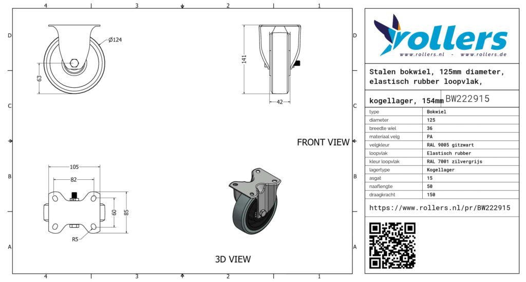 Dit bokwiel heeft een gaffel van staal. Het wiel heeft een bouwhoogte van 154 millimeter. De velg is gemaakt van PA (kleur RAL 9005 gitzwart) en het loopvlak is van elastisch rubber (kleur RAL 7001 zilvergrijs). De diameter van het wiel is 125 millimeter en de breedte 36 millimeter. De naaflengte is 50 millimeter en het asgat heeft een diameter van 15 millimeter. Het wiel heeft een draagvermogen van 150 kilogram. De lagering bestaat uit een kogellager. Dit product komt in onze shop voor in de volgende categorieën: Rubberen wielen, Vuilcontainer wielen, Rolcontainer wielen, Bokwielen 150 kg, Bokwielen 125 mm, Transportwielen, Bokwiel.