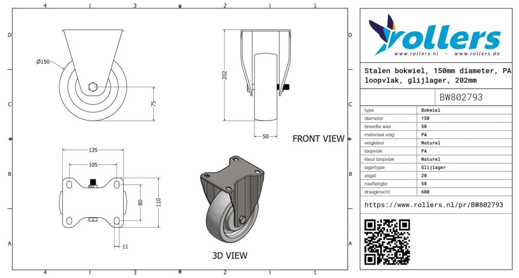Dit is een bokwiel met een gaffel van staal. De bouwhoogte is 202 mm. Het materiaal van het wiel is PA (kleur naturel). De diameter van het wiel is 150 mm en de breedte 50 mm. De naaflengte bedraagt 58 mm bij een asgat van 20 mm. Het draagvermogen is 600 kilo. De lagering bestaat uit een glijlager. U vindt dit product in onze categorieën: Zwaarlast bokwielen, Bokwielen 500 kg, Bokwielen 150 mm, Transportwielen, Nylon wielen, Zwaarlastwielen, Bokwiel.