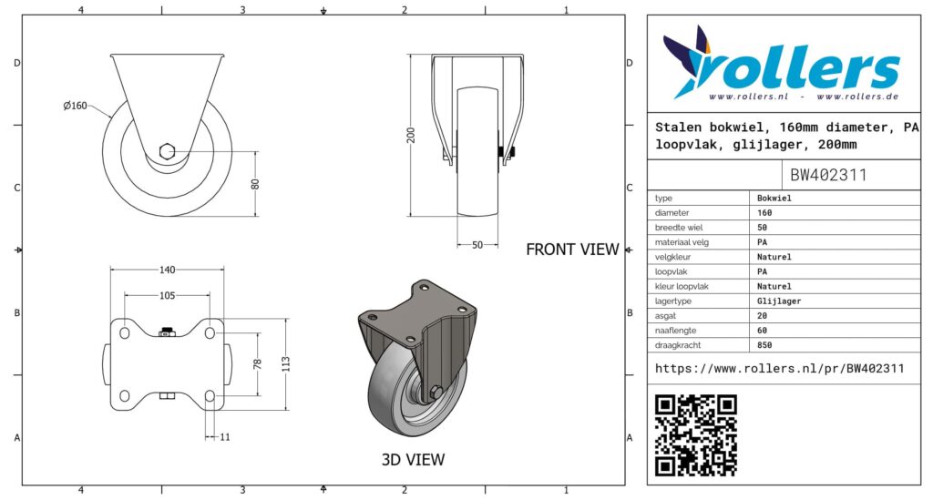 Dit is een bokwiel met een stalen gaffel. De bouwhoogte is 200 mm. Het wiel bestaat in zijn geheel uit PA (kleur naturel). Het wiel heeft een diameter van 160 mm en een breedte van 50 mm. De naaflengte is 60 mm en het asgat heeft een diameter van 20 mm. Het wiel heeft een draagvermogen van 850 kg. Het wiel is gelagerd met een glijlager. U vindt dit product in onze categorieën: Zwaarlast bokwielen, Bokwielen 800 kg, Bokwielen 160 mm, Transportwielen, Nylon wielen, Zwaarlastwielen, Bokwiel.