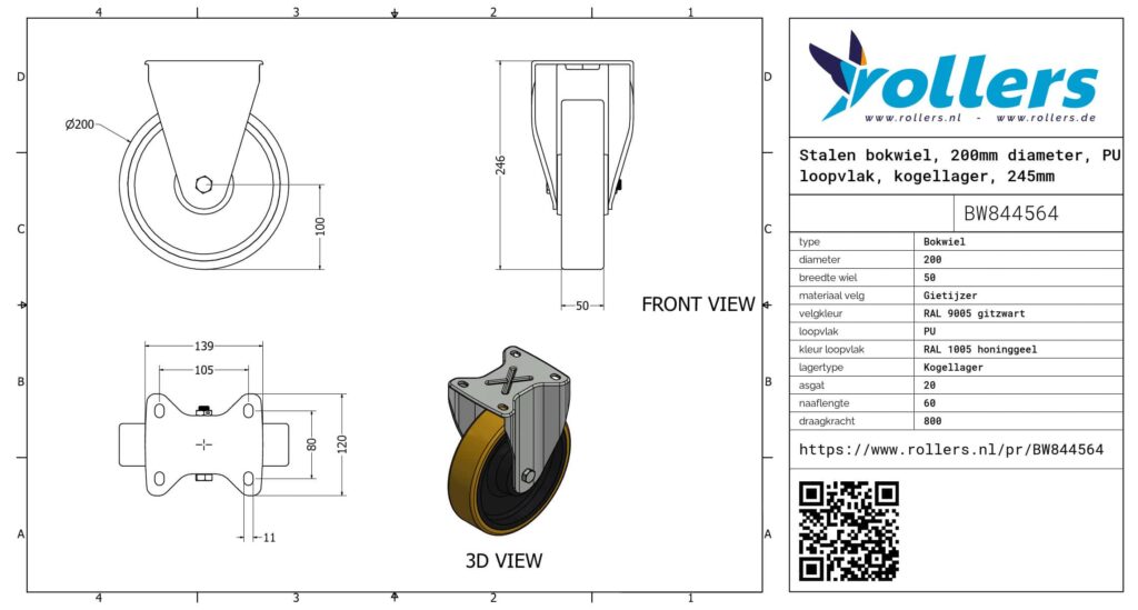 Dit is een bokwiel van staal. De bouwhoogte is 245 mm. De velg is gemaakt van gietijzer (RAL 9005 gitzwart van kleur) en het loopvlak is van PU (RAL 1005 honinggeel). Het wiel heeft een diameter van 200 mm en een breedte van 50 mm. De naaflengte bedraagt 60 mm bij een asgat van 20 mm. Het wiel heeft een draagvermogen van 800 kg. Het wiel is gelagerd met een kogellager.