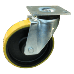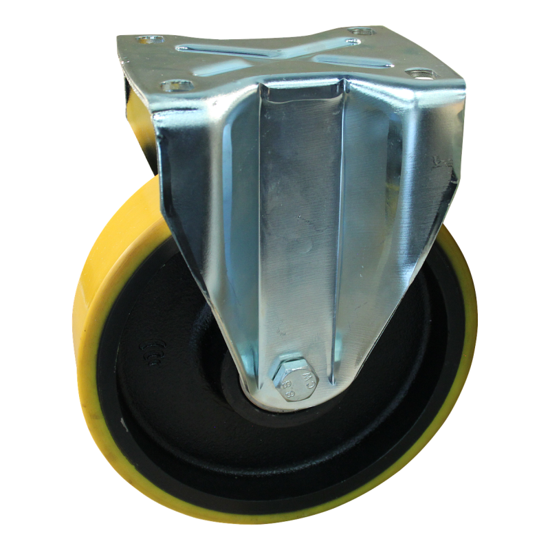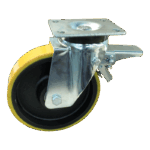 Dit is een bokwiel met een gaffel van staal. De bouwhoogte bedraagt 300 mm. De velg is gemaakt van aluminium en het loopvlak is van PU (kleur RAL 1005 honinggeel). Het wiel heeft een diameter van 250 mm en een breedte van 50 mm. Het bokwiel heeft een draagvermogen van 800 kg. De lagering bestaat uit een kogellager.