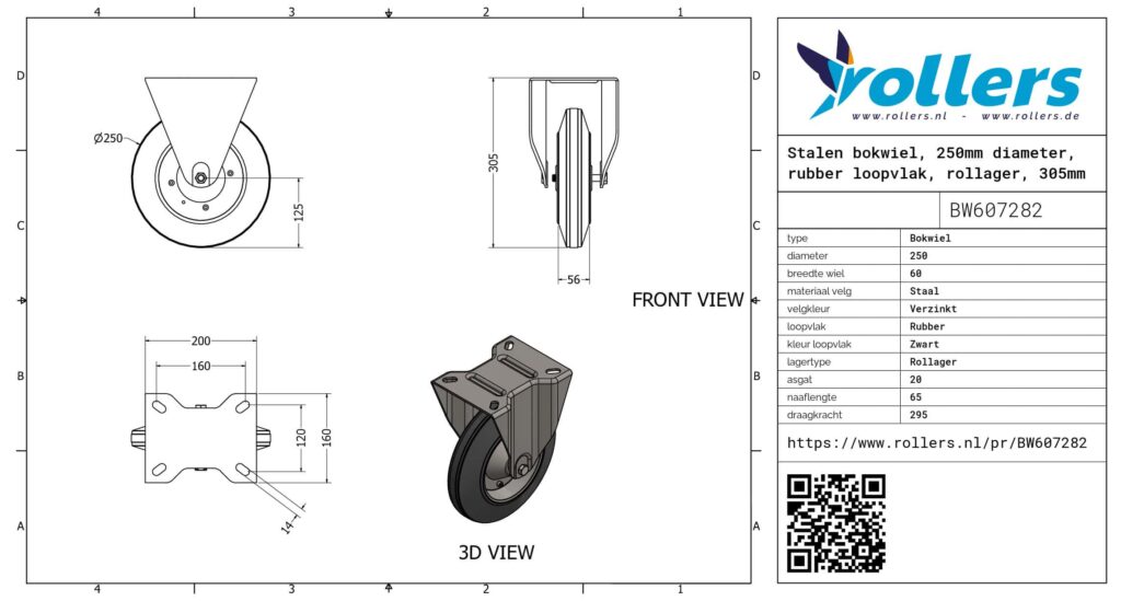 Dit is een bokwiel van staal. De bouwhoogte is 305 mm. De velg is gemaakt van staal (verzinkt) en het loopvlak is van rubber (zwart). De diameter van het wiel is 250 mm en de breedte 60 mm. De naaflengte is 65 mm en het asgat heeft een diameter van 20 mm. Het wiel heeft een draagvermogen van 295 kg. De lagering bestaat uit een rollager.