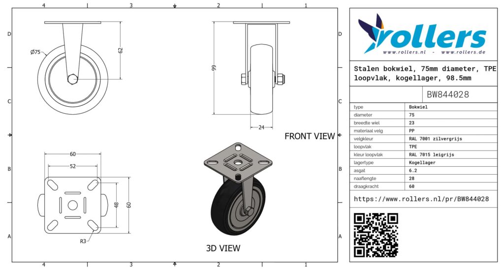 Dit is een bokwiel met een stalen gaffel. De bouwhoogte is 98.5 millimeter. De velg is gemaakt van PP (RAL 7001 zilvergrijs van kleur) en het loopvlak is van TPE (kleur RAL 7015 leigrijs). Het wiel heeft een diameter van 75 millimeter en een breedte van 23 millimeter. De naaflengte bedraagt 28 millimeter bij een asgat van 6.2 millimeter. De draagkracht is 60 kg. Het wiel is gelagerd met een kogellager. Rollers.nl heeft dit product in de volgende categorieën ingedeeld: Kleine bokwieltjes, Bokwielen 50 kg, Bokwielen 75 mm, Bokwiel. Merk: Novio.