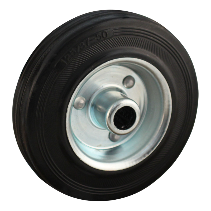 Dit is een los wiel van staal. De velg is gemaakt van staal (kleur verzinkt) en het loopvlak is van rubber (kleur zwart). Het wiel heeft een diameter van 125 millimeter en een breedte van 37 millimeter. De naaflengte is 52 millimeter en het asgat heeft een diameter van 15 millimeter. Het draagvermogen is 100 kilogram. Het wiel is gelagerd met een rollager.
