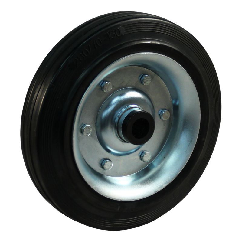 Dit is een los wiel van het materiaal staal. Het materiaal van de velg is staal (verzinkt van kleur) en van het loopvlak rubber (zwart van kleur). De diameter van het wiel is 280 millimeter en de breedte 70 millimeter. De naaflengte bedraagt 75 millimeter bij een asgat van 25 millimeter. De draagkracht is 300 kilogram. Het wiel is gelagerd met een rollager.