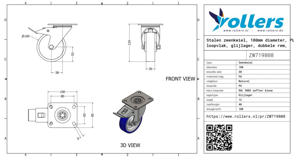 Dit zwenkwiel heeft een gaffel van staal. De rem is van het type dubbele rem, naloop. Deze kan worden bevestigd door middel van een plaat. Het wiel heeft een bouwhoogte van 128 mm. Het materiaal van de velg is PA (naturel van kleur) en van het loopvlak PU (RAL 5003 saffier blauw van kleur). Het wiel heeft een diameter van 100 mm en een breedte van 30 mm. De naaflengte bedraagt 40 mm bij een asgat van 12 mm. De draagkracht is 180 kilogram. De lagering bestaat uit een glijlager. Rollers.nl heeft dit product in de volgende categorieën ingedeeld: Vuilcontainer wielen, Rolcontainer wielen, Zwenkwielen 150 kg, Polyurethaan wielen, Zwenkwielen 100 mm, Transportwielen, Zwenkwielen met rem, PU wielen, Zwenkwiel.