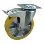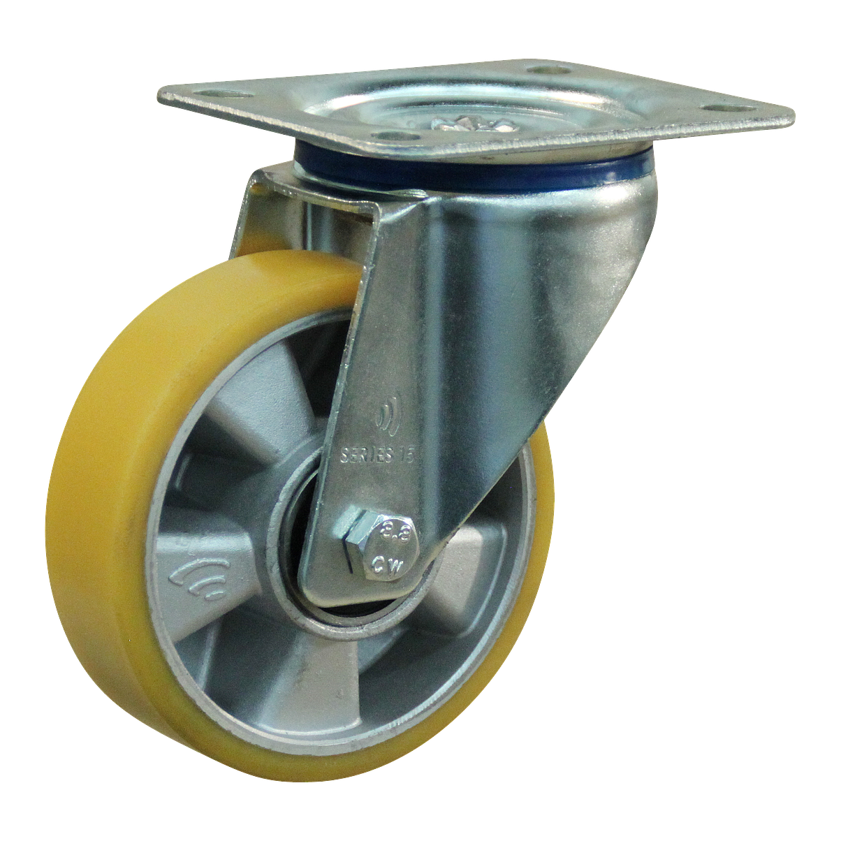 Dit is een zwenkwiel met een stalen gaffel. De bevestiging is van het type plaat. Het wiel heeft een bouwhoogte van 128 mm. Het materiaal van de velg is aluminium en van het loopvlak PU (RAL 1005 honinggeel van kleur). De diameter van het wiel is 100 mm en de breedte 30 mm. De naaflengte bedraagt 40 mm bij een asgat van 15 mm. Het zwenkwiel heeft een draagvermogen van 200 kilogram. Het wiel is gelagerd met een kogellager.