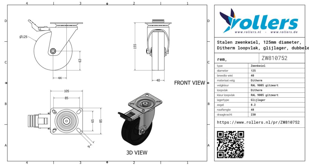 Dit is een zwenkwiel van staal. De rem is van het type dubbele rem, naloop. Deze kan worden bevestigd door middel van een plaat. De bouwhoogte is 155 millimeter. De velg is gemaakt van Ditherm (kleur RAL 9005 gitzwart) en het loopvlak is van Ditherm (RAL 9005 gitzwart). Het wiel heeft een diameter van 125 millimeter en een breedte van 40 millimeter. De naaflengte bedraagt 48 millimeter bij een asgat van 8.2 millimeter. Het wiel heeft een draagvermogen van 230 kg. Het wiel is gelagerd met een glijlager. Dit product komt in onze shop voor in de volgende categorieën: Zwenkwielen 200 kg, Zwenkwielen 125 mm, Zwenkwielen met rem, Zwenkwiel. Merk: Novio.