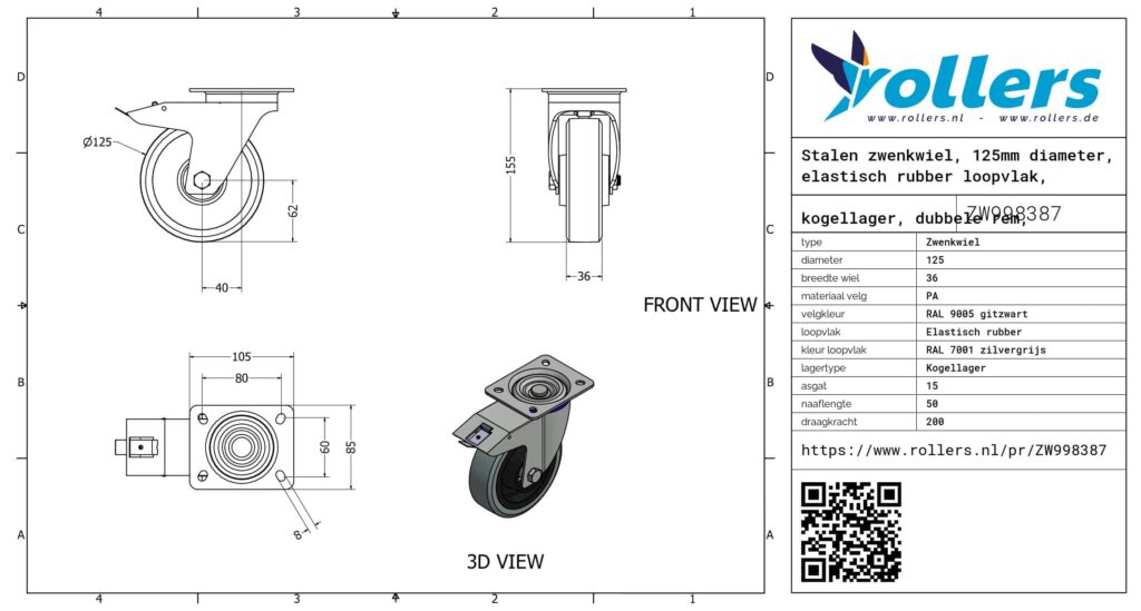 Dit is een zwenkwiel met een stalen gaffel. De rem is van het type dubbele rem, naloop. De bevestiging is van het type plaat. De bouwhoogte is 154 mm. De velg is gemaakt van PA (RAL 9005 gitzwart) en het loopvlak is van elastisch rubber (RAL 7001 zilvergrijs). De diameter van het wiel is 125 mm en de breedte 36 mm. De naaflengte is 50 mm en het asgat heeft een diameter van 15 mm. Het zwenkwiel heeft een draagvermogen van 200 kilogram. Het wiel is gelagerd met een kogellager. U vindt dit product in onze categorieën: Rubberen wielen, Vuilcontainer wielen, Rolcontainer wielen, Zwenkwielen 200 kg, Zwenkwielen 125 mm, Rubberen zwenkwielen, Transportwielen, Zwenkwielen met rem, Zwenkwiel.
