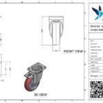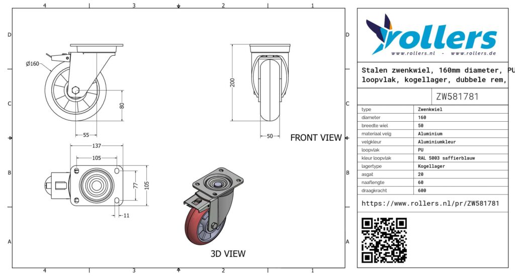 Dit zwenkwiel heeft een gaffel van staal. De rem is van het type dubbele rem, naloop. Het zwenkwiel wordt bevestigd met een plaat. De bouwhoogte bedraagt 200 mm. Het materiaal van de velg is aluminium en van het loopvlak PU (RAL 5003 saffierblauw van kleur). Het wiel heeft een diameter van 160 mm en een breedte van 50 mm. De naaflengte is 60 mm en het asgat heeft een diameter van 20 mm. Het draagvermogen is 600 kilo. Het wiel is gelagerd met een kogellager.