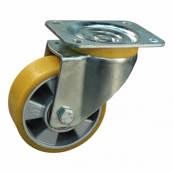 Dit is een zwenkwiel met een gaffel van staal. Deze kan worden bevestigd door middel van een plaat. De bouwhoogte bedraagt 200 mm. Het materiaal van de velg is aluminium en van het loopvlak PU (kleur RAL 1005 honinggeel). De diameter van het wiel is 160 mm en de breedte 50 mm. De naaflengte bedraagt 60 mm bij een asgat van 20 mm. Het draagvermogen is 600 kilo. Het wiel is gelagerd met een kogellager.