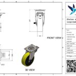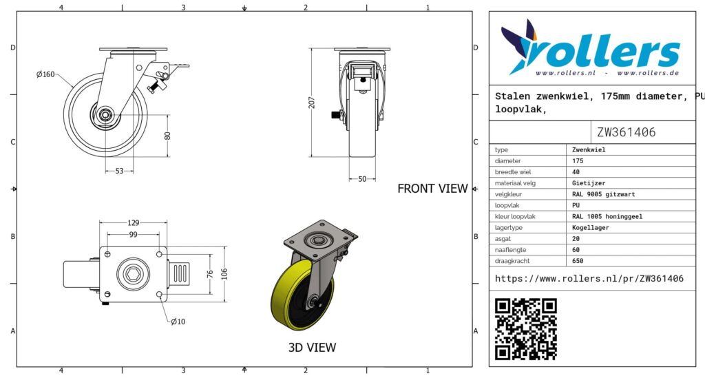 Dit is een zwenkwiel van staal. De bevestiging is van het type plaat. De bouwhoogte bedraagt 232 millimeter. Het materiaal van de velg is gietijzer (kleur RAL 9005 gitzwart) en van het loopvlak PU (RAL 1005 honinggeel). Het wiel heeft een diameter van 175 millimeter en een breedte van 40 millimeter. De naaflengte bedraagt 60 millimeter bij een asgat van 20 millimeter. Het wiel heeft een draagvermogen van 650 kilo. Het wiel is gelagerd met een kogellager.