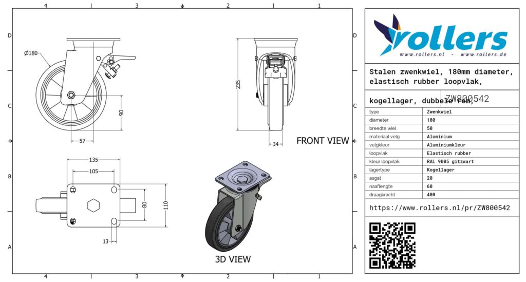 Dit is een zwenkwiel van staal. Het wiel heeft een rem van het type dubbele rem, voorloop. De bevestiging is van het type plaat. Het wiel heeft een bouwhoogte van 235 mm. Het materiaal van de velg is aluminium en van het loopvlak elastisch rubber (RAL 9005 gitzwart). De diameter van het wiel is 180 mm en de breedte 50 mm. De naaflengte bedraagt 60 mm bij een asgat van 20 mm. Het zwenkwiel heeft een draagvermogen van 400 kilogram. Het wiel is gelagerd met een kogellager. Dit product komt in onze shop voor in de volgende categorieën: Rubberen wielen, Vuilcontainer wielen, Rolcontainer wielen, Zwenkwielen 300 kg, Zwenkwielen 180 mm, Rubberen zwenkwielen, Transportwielen, Zwenkwielen met rem, Zwaarlastwielen, Zwaarlast zwenkwielen, Zwenkwiel.