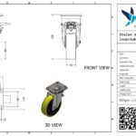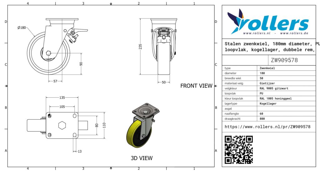Dit is een zwenkwiel met een stalen gaffel. De rem is van het type dubbele rem, voorloop. Deze kan worden bevestigd door middel van een plaat. Het wiel heeft een bouwhoogte van 235 mm. De velg is gemaakt van gietijzer (RAL 9005 gitzwart van kleur) en het loopvlak is van PU (kleur RAL 1005 honinggeel). Het wiel heeft een diameter van 180 mm en een breedte van 50 mm. De draagkracht is 800 kilogram. De lagering bestaat uit een kogellager.