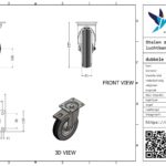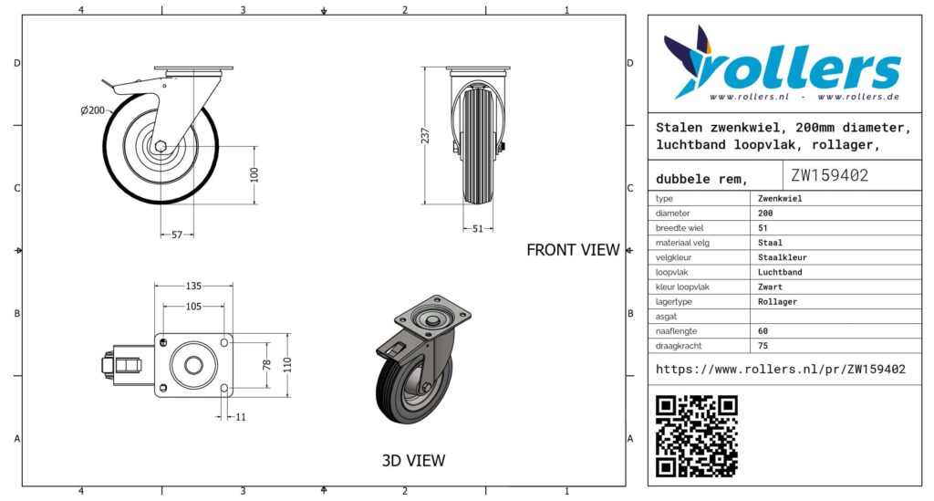 Stalen zwenkwiel, 200mm diameter, luchtband loopvlak, rollager, dubbele rem, naloop