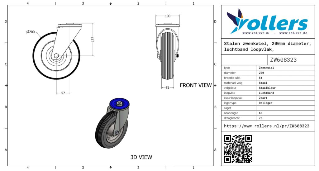 Dit is een stalen zwenkwiel. Deze kan worden bevestigd door middel van een boutgat. De bouwhoogte is 225 mm. De velg is gemaakt van staal en het loopvlak is van luchtband (zwart van kleur). De diameter van het wiel is 200 mm en de breedte 51 mm. Het draagvermogen is 75 kilogram. Het wiel is gelagerd met een rollager. U vindt dit product in onze categorieën: Zwenkwielen met luchtband, Zwenkwielen 50 kg, Zwenkwielen 200 mm, Transportwielen, Zwenkwielen zonder rem, Zwenkwiel.