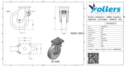 Dit is een zwenkwiel met een stalen gaffel. Het wiel heeft een rem van het type dubbele rem, voorloop. Deze kan worden bevestigd door middel van een plaat. Het wiel heeft een bouwhoogte van 245 mm. Het materiaal van het wiel is PA (naturel). Het wiel heeft een diameter van 200 mm en een breedte van 50 mm. De naaflengte bedraagt 60 mm bij een asgat van 20 mm. Het wiel heeft een draagvermogen van 800 kilo. Het wiel is gelagerd met een glijlager.