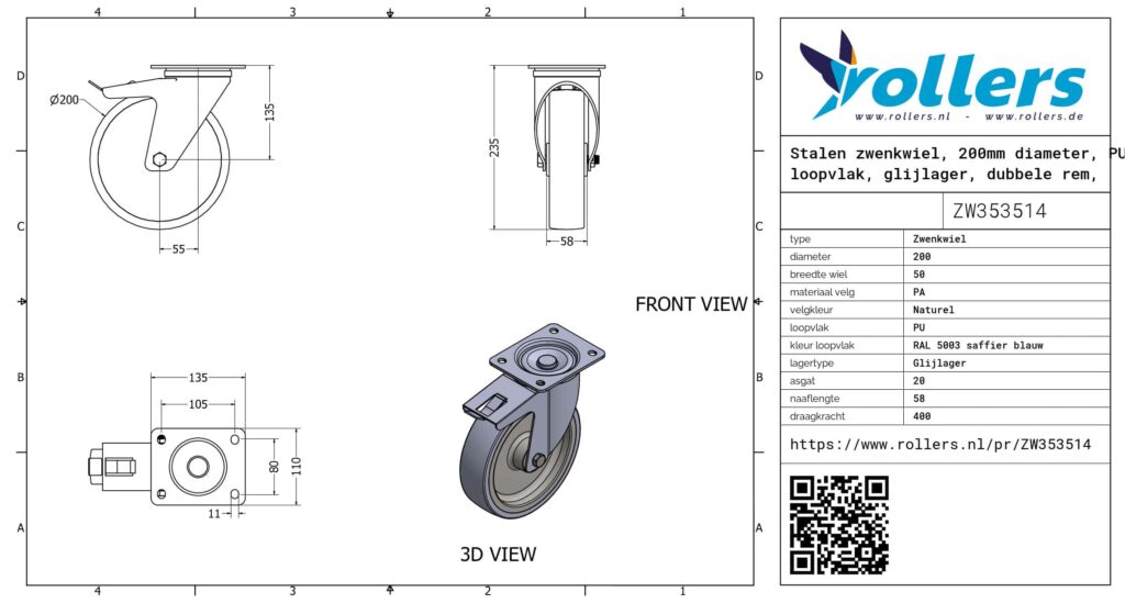 Dit is een zwenkwiel met een gaffel van staal. Het wiel heeft een rem van het type dubbele rem, naloop. De bevestiging is van het type plaat. De bouwhoogte bedraagt 235 mm. De velg is gemaakt van PA (naturel van kleur) en het loopvlak is van PU (RAL 5003 saffier blauw). Het wiel heeft een diameter van 200 mm en een breedte van 50 mm. De naaflengte bedraagt 58 mm bij een asgat van 20 mm. Het zwenkwiel heeft een draagvermogen van 400 kilo. Het wiel is gelagerd met een glijlager. Dit product komt in onze shop voor in de volgende categorieën: Vuilcontainer wielen, Rolcontainer wielen, Zwenkwielen 300 kg, Polyurethaan wielen, Zwenkwielen 200 mm, Transportwielen, Zwenkwielen met rem, Zwaarlastwielen, Zwaarlast zwenkwielen, PU wielen, Zwenkwiel.