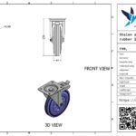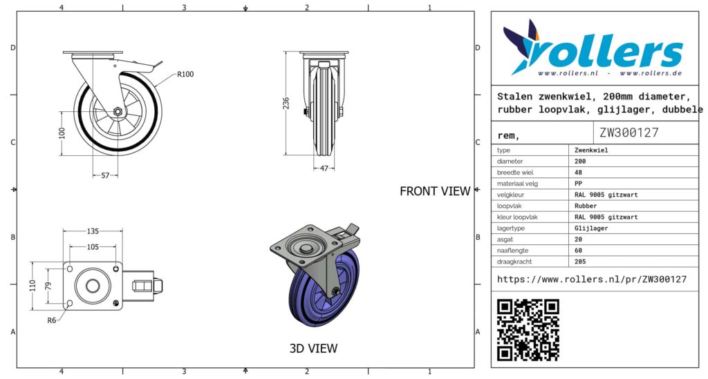 Stalen zwenkwiel, 200mm diameter, rubber loopvlak, glijlager, dubbele rem, naloop