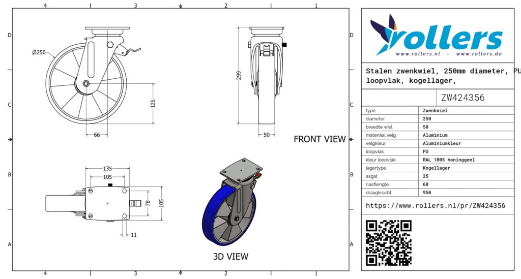 Dit is een zwenkwiel van staal. Dit wiel heeft een wielrem. Het zwenkwiel wordt bevestigd met een plaat. De bouwhoogte is 299 millimeter. De velg is gemaakt van aluminium en het loopvlak is van PU (kleur RAL 1005 honinggeel). De diameter van het wiel is 250 millimeter en de breedte 50 millimeter. De naaflengte bedraagt 60 millimeter bij een asgat van 25 millimeter. De draagkracht is 950 kilo. De lagering bestaat uit een kogellager. Rollers.nl heeft dit product in de volgende categorieën ingedeeld: Zwaarlast zwenkwielen met druklager, Zwenkwielen 800 kg, Zwenkwielen 250 mm, Polyurethaan wielen, Transportwielen, Zwenkwielen met rem, Zwaarlastwielen, Zwaarlast zwenkwielen, PU wielen, Zwenkwiel.