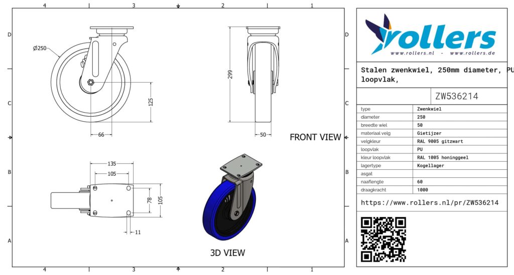 Dit is een zwenkwiel met een gaffel van staal. De bevestiging is van het type plaat. De bouwhoogte bedraagt 299 mm. Het materiaal van de velg is gietijzer (RAL 9005 gitzwart) en van het loopvlak PU (RAL 1005 honinggeel). De diameter van het wiel is 250 mm en de breedte 50 mm. De draagkracht is 1000 kilo. De lagering bestaat uit een kogellager. Rollers.nl heeft dit product in de volgende categorieën ingedeeld: Zwaarlast zwenkwielen met druklager, Zwenkwielen 1000 kg, Zwenkwielen 250 mm, Polyurethaan wielen, Transportwielen, Zwenkwielen zonder rem, Zwaarlastwielen, Zwaarlast zwenkwielen, PU wielen, Zwenkwiel.