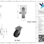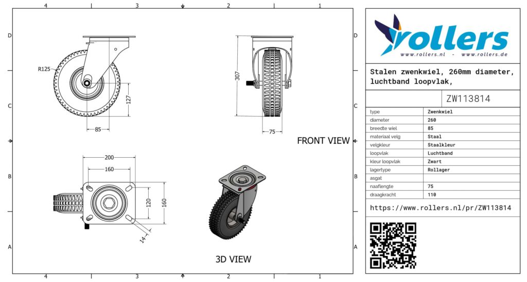 Dit is een zwenkwiel met een stalen gaffel. Deze kan worden bevestigd door middel van een plaat. De bouwhoogte is 307 millimeter. De velg is gemaakt van staal en het loopvlak is van luchtband (kleur zwart). De diameter van het wiel is 260 millimeter en de breedte 85 millimeter. De draagkracht is 110 kilogram. De lagering bestaat uit een rollager.