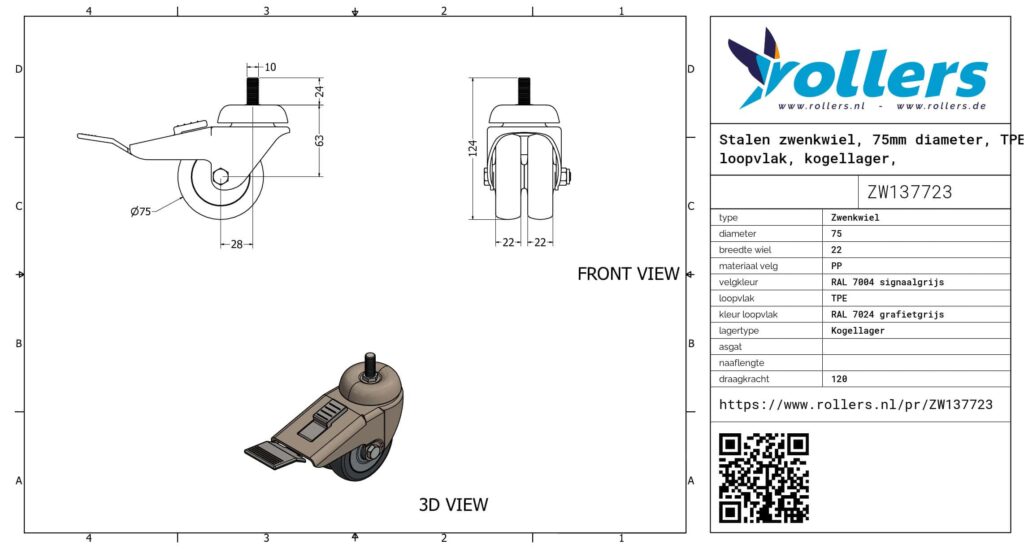 Dit is een zwenkwiel met een stalen gaffel. Dit wiel heeft een wielrem. Deze kan worden bevestigd door middel van een draadstift. Het wiel heeft een bouwhoogte van 100 millimeter. De velg is gemaakt van PP (kleur RAL 7004 signaalgrijs) en het loopvlak is van TPE (RAL 7024 grafietgrijs van kleur). De diameter van het wiel is 75 millimeter en de breedte 22 millimeter. De draagkracht is 120 kilo. De lagering bestaat uit een kogellager. Merk: Steinco.