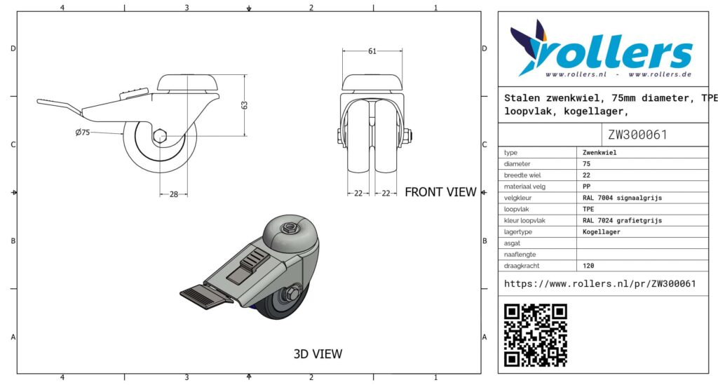 Dit is een zwenkwiel met een stalen gaffel. Het wiel heeft een rem van het type wielrem. Deze kan worden bevestigd door middel van een boutgat. De bouwhoogte is 100 mm. Het materiaal van de velg is PP (RAL 7004 signaalgrijs van kleur) en van het loopvlak TPE (RAL 7024 grafietgrijs). De diameter van het wiel is 75 mm en de breedte 22 mm. Het wiel heeft een draagvermogen van 120 kg. De lagering bestaat uit een kogellager. Merk: Steinco.
