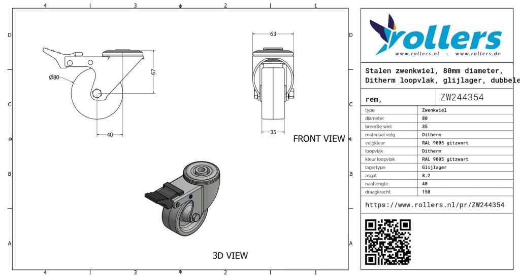 Dit is een zwenkwiel van staal. Dit wiel heeft een dubbele rem, naloop. Het zwenkwiel wordt bevestigd met een boutgat. De bouwhoogte is 108 millimeter. De velg is gemaakt van Ditherm (RAL 9005 gitzwart van kleur) en het loopvlak is van Ditherm (RAL 9005 gitzwart). De diameter van het wiel is 80 millimeter en de breedte 35 millimeter. De naaflengte is 40 millimeter en het asgat heeft een diameter van 8.2 millimeter. Het draagvermogen is 150 kg. De lagering bestaat uit een glijlager. U vindt dit product in onze categorieën: Kleine zwenkwieltjes, Zwenkwieltjes met rem, Zwenkwielen 150 kg, Zwenkwielen 80 mm, Zwenkwielen met rem, Zwenkwiel. Merk: Novio.